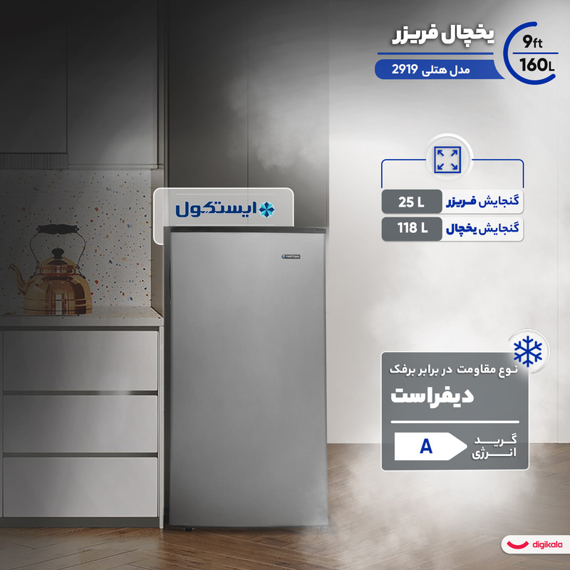 یخچال فریزر 9 فوت ایستکول مدل هتلی 2919، با ارتفاع 108، عمق 56 و پهنای 54 سانتی متر، مصرف انرژی A، دارای 3 طبقه در یخچال و 1 طبقه در فریزر، دارای کندانسور مخفی