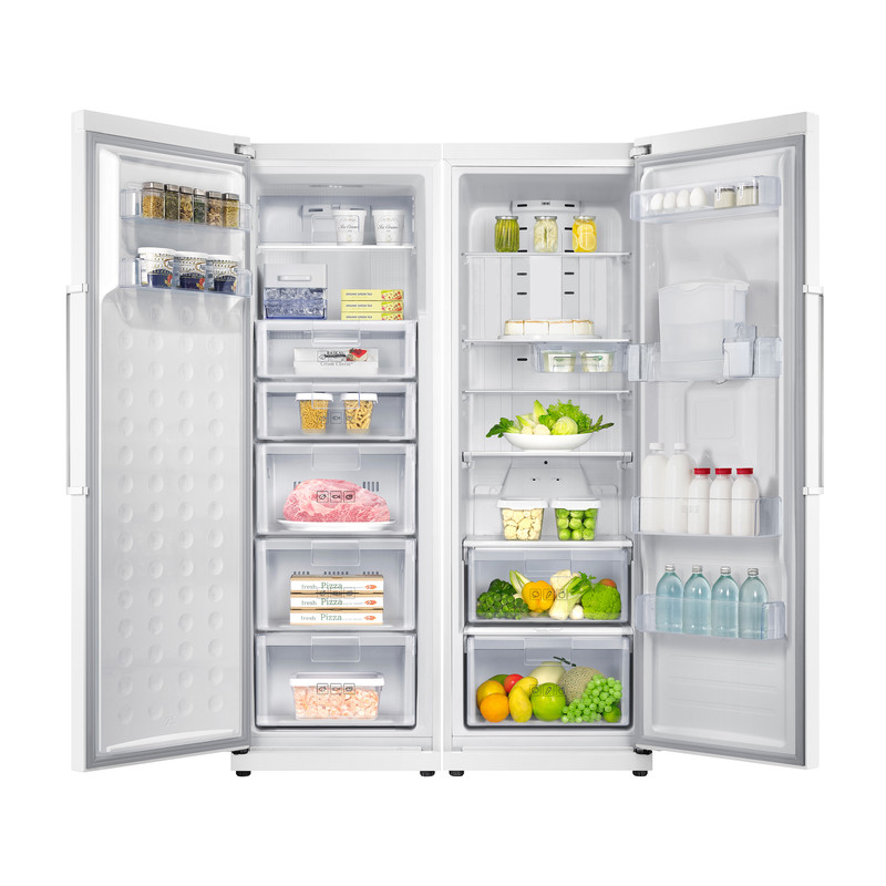 یخچال و فریزر دوقلو بلانتون مدل BAM-RE2021W با ظرفیت 38 فوت و طراحی مدرن، انتخابی ایدهآل برای خانوادههای پرجمعیت است که به فضای ذخیرهسازی بزرگ و امکانات پیشرفته نیاز دارند. این دستگاه با گنجایش کلی 675 لیتر (365 لیتر برای یخچال و 310 لیتر برای فریزر) بهگونهای طراحی شده تا تمامی نیازهای ذخیرهسازی مواد غذایی را برطرف کند. ابعاد یخچال و فریزر دوقلو بلانتون مدل BAM-RE2021W (ارتفاع 180 سانتیمتر، پهنا 120 سانتیمتر، عمق 70 سانتیمتر) مناسب برای آشپزخانههای بزرگ است. این مدل دوقلو امکان جابهجایی و نصب جداگانه یخچال و فریزر را فراهم میکند که در مواقع تغییر دکوراسیون بسیار کارآمد است. بخش یخچال دارای 5 طبقه، 2 کشو و 4 طبقه روی درب است که فضایی کاملاً منظم و قابلتنظیم برای نگهداری مواد غذایی فراهم میکند. کشوهای یخچال باقابلیت تنظیم رطوبت، تازگی میوهها و سبزیها را برای مدت طولانیتری حفظ میکنند. فریزر با ظرفیت 310 لیتر و طراحی منظم شامل 2 طبقه، 2 طبقه روی درب و 5 کشو، فضایی ایدهآل برای نگهداری مواد منجمد ایجاد کرده است. یخساز دستی هم استفاده از این بخش را راحتتر میکند. ویژگیهای مدرنی مانند نوفراست (بدون برفک)، صفحهنمایش لمسی و قابلیتهایی چون تنظیم هوشمند دما و رطوبت، Power Freeze و Power Cool و حالت تعطیلات برای صرفهجویی در مصرف انرژی، این دستگاه را به انتخابی هوشمندانه تبدیل کرده است. مصرف انرژی با رتبه A نشاندهنده بهرهوری بالای این مدل است. یخچال و فریزر دوقلو بلانتون مدل BAM-RE2021W با امکانات پیشرفته، ظرفیت بالا و طراحی جذاب، گزینهای مطلوب برای خانوادههایی است که به دنبال کارایی، زیبایی و کیفیت هستند.