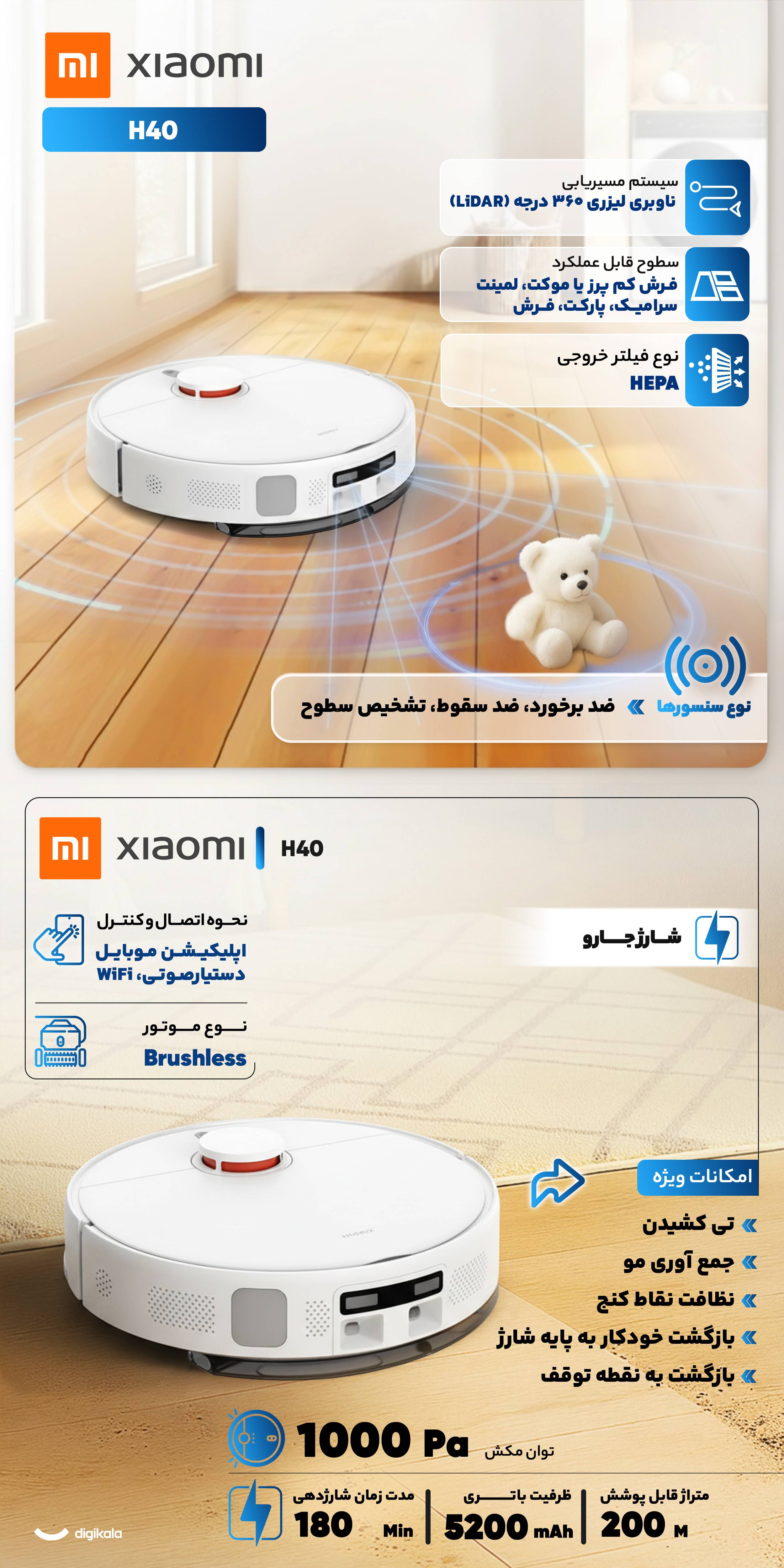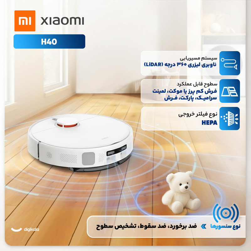 جارو رباتیک شیائومی مدل H40 به گونهای طراحی شده که پاسخگوی نیازهای خانههای بزرگ و کاربرانی باشد که به دنبال نظافت دقیق، هوشمند و بدون دردسر هستند. ابعاد ۹۷ در ۳۴۰ در ۳۴۰ میلیمتری آن به همراه وزن ۳۶۴۰ گرم باعث شده دستگاه بهسادگی روی انواع سطوح حرکت کند و حتی از آستانههای درب تا ارتفاع ۲۰ میلیمتر عبور کند. پایه شارژ نیز با ابعاد ۳۴۰ در ۳۲۶ در ۱۶۰ میلیمتر نقش یک ایستگاه همهکاره را ایفا میکند و با داشتن مخزن آب چهار لیتری، فرآیند مدیریت آب برای طیکشی را آسان میکند. توان مکش بسیار قدرتمند ۱۰۰۰۰ پاسکال همراه با موتور براشلس ۷۰ واتی و فیلتر HEPA در خروجی جریان هوا سبب شده این مدل در حذف گردوغبار، ذرات ریز و آلودگیهای عمیق فرش عملکردی کمنظیر ارائه دهد. باتری ۵۲۰۰ میلیآمپر ساعت امکان فعالیت تا ۱۸۰ دقیقه را فراهم میکند و دستگاه در یک بار شارژ میتواند فضایی حدود ۲۰۰ مترمربع را پوشش دهد. این جارو رباتیک برای ارائه نظافتی کامل از سیستم مکش و طیکشی همزمان بهره میبرد و لنتهای پاککننده در هنگام عبور از فرش بهصورت هوشمند بالا میروند تا رطوبت به بافت فرش منتقل نشود. مخزن زباله با ظرفیت چهار لیتر برای استفاده طولانیمدت طراحی شده و همراهی آن با سیستم تخلیه آب کثیف در پایه شارژ روند نگهداری را سادهتر کرده است. استفاده از نقشهبرداری لیزری LiDAR، برنامهریزی مسیرهای دقیق و تعیین مناطق ممنوع، موجب شده دستگاه با دقت بالا محیط را اسکن کند و مسیرهای منظم و کارآمد ایجاد شود. مجموعه حسگرهای هوشمند شامل تشخیص سطوح، ضدبرخورد، ضدسقوط و تشخیص ضخامت فرش باعث شده دستگاه بدون آسیبدیدن و بدون برخورد به موانع حرکت کند. اتصال از طریق WiFi و کنترل کامل از راه دور با اپلیکیشن Mi Home یا Xiaomi Home تجربهای روان و کاربردی ایجاد کرده و پشتیبانی از دستیارهای صوتی Google Assistant و Amazon Alexa امکان صدور فرمانهای صوتی را نیز فراهم کرده است. این مدل برای سطوحی مانند سرامیک، پارکت و موکت کمپرز مناسب است و همراهی موتور قدرتمند، مخزن بزرگ و سیستم ناوبری پیشرفته آن را به انتخابی ایدهآل برای خانههای مدرن تبدیل کرده است.
